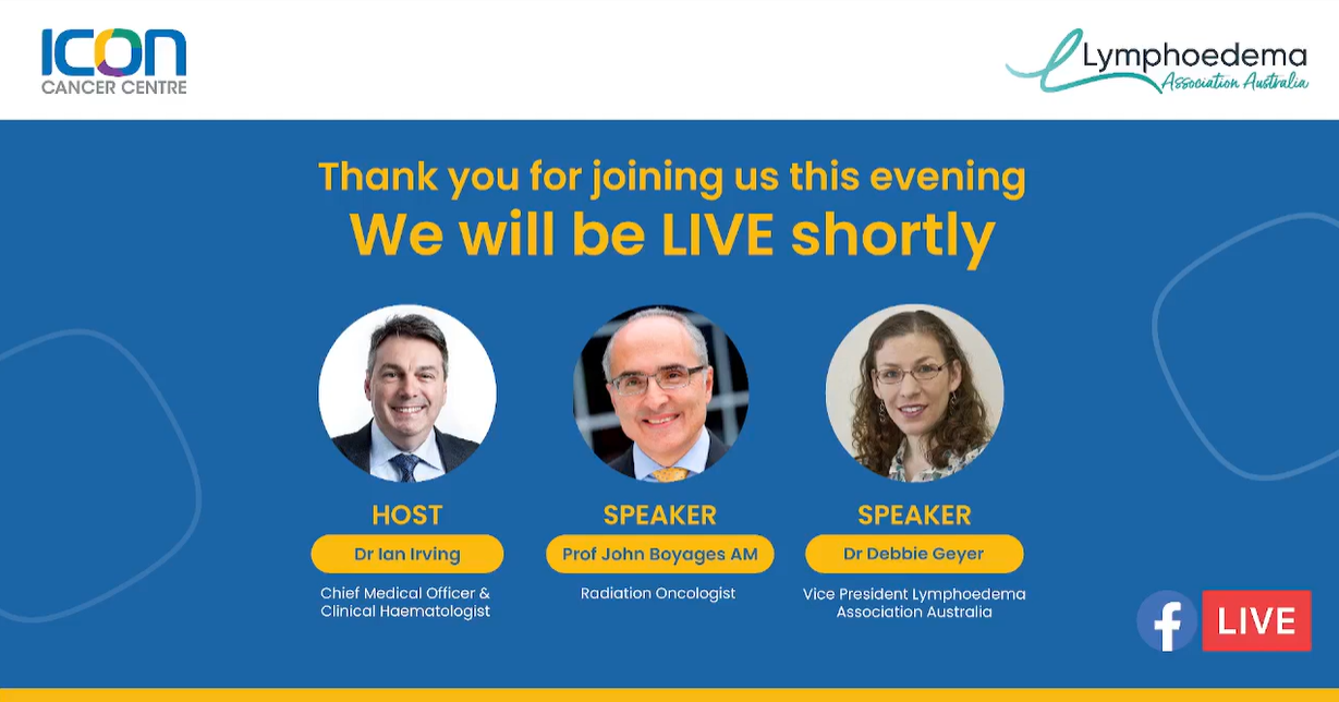 Radiation Oncologist and author Prof John Boyages AM and Director of the Australian Lymphoedema Education, Research and Treatment (ALERT) Program Macquarie University Louise Koelmeyer PhD recently appeared live on the Icon Cancer Centre Facebook page hosted by Icon Medical Director Dr Ian Irving, where they discussed breast cancer, lymphoedema and its management.