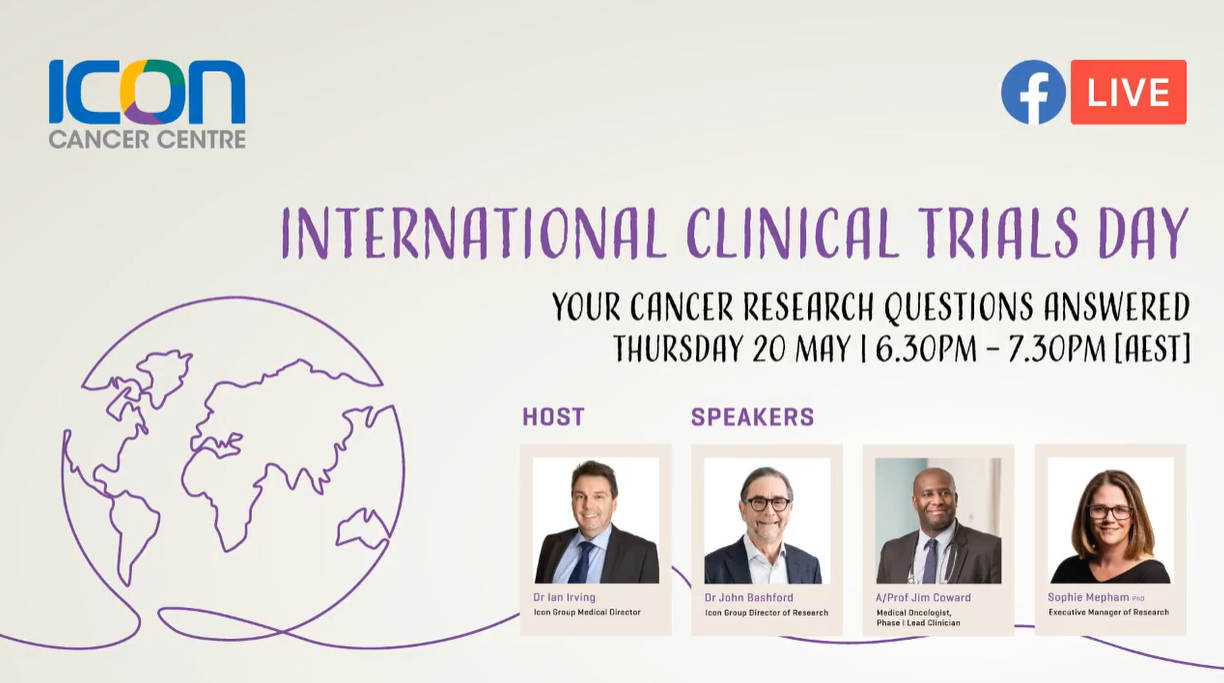 Icon Director of Research Dr John Bashford, Medical Oncologist A/Prof Jim Coward and Icon Executive Manager of Research Sophie Mepham recently appeared live on the Icon Cancer Centre Facebook page hosted by Icon Medical Director Dr Ian Irving, where they discussed the latest in clinical trials and cancer research. From understanding immunotherapy and Phase I clinical trials to discussing the latest milestone research, find out what’s next in cancer treatment by watching the Facebook Live below.