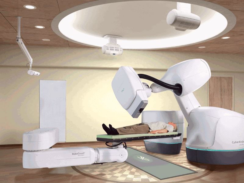 CyberKnife is the only fully robotic radiation delivery system. Its robotic arm moves around a patient, delivering high energy x-ray beams with a high level of accuracy and precision in a sequence of software-generated angles.